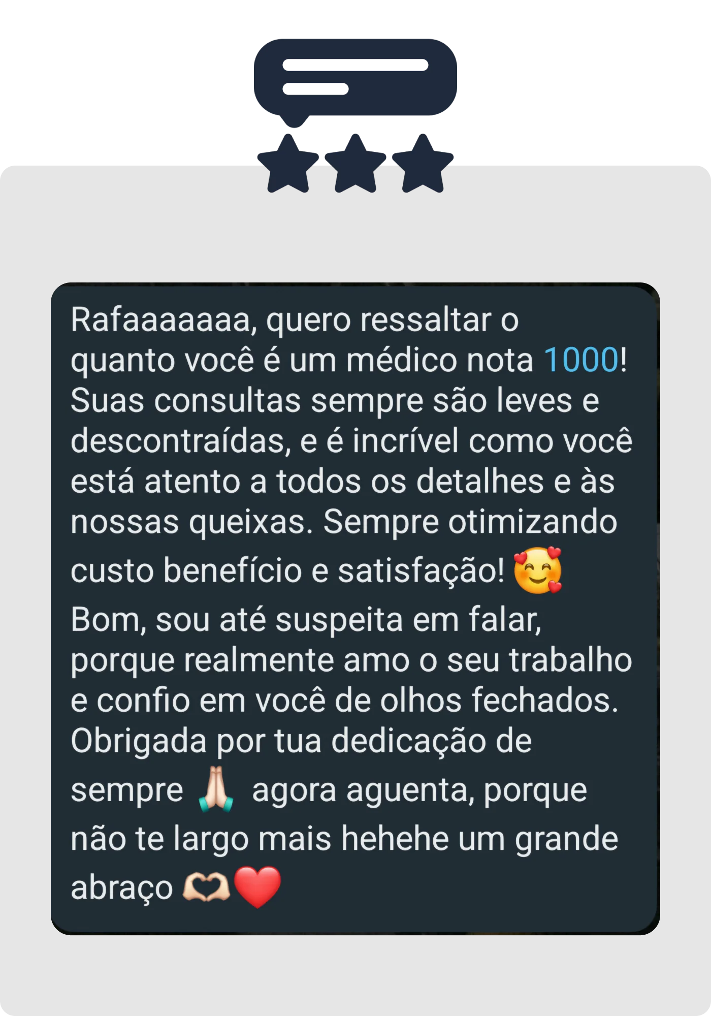 O Dr. Rafael aceita apenas um número limitado de pacientes por mês para garantir um atendimento personalizado e minucioso, com a atenção que você merece.